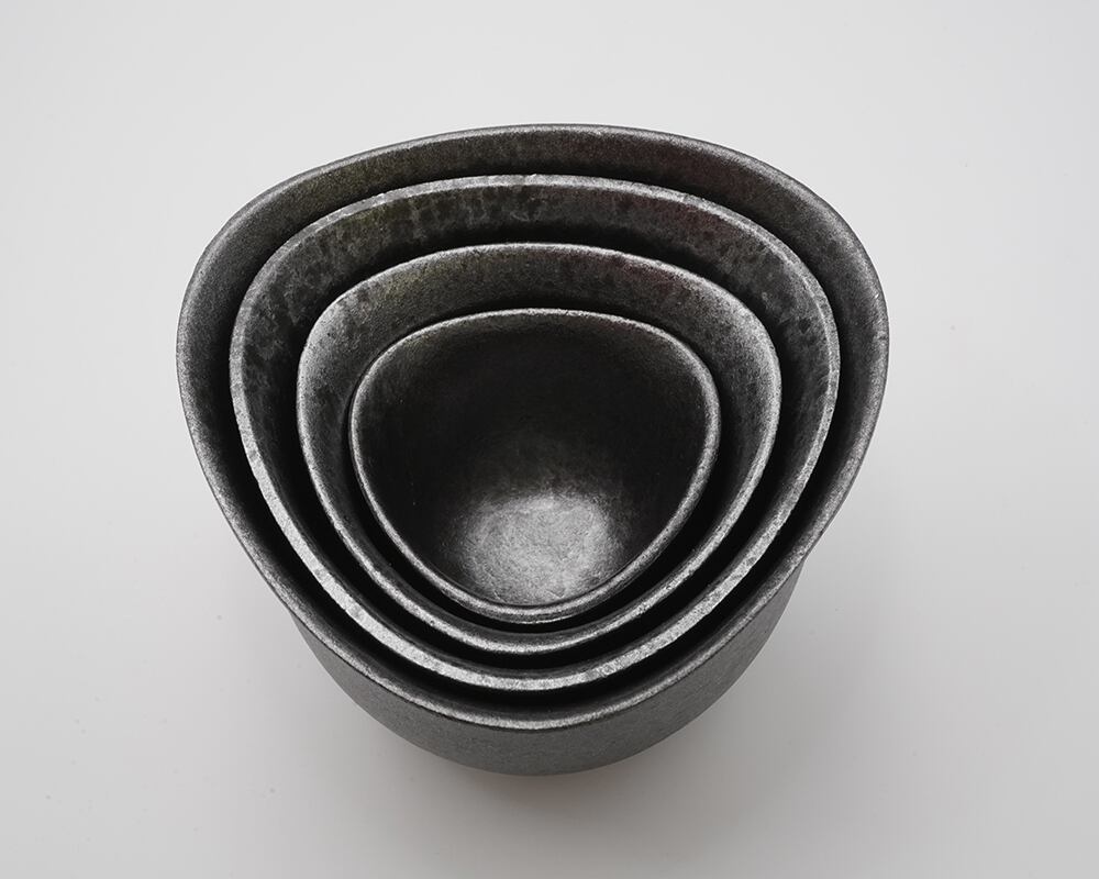 This musubi plate features a gentle triangular shape modeled after rice balls. It looks like ceramic, but is actually made of aluminum. It was born from the earnest desire of seniors who said, “Plastic tableware just doesn't make food taste good.” To make the aluminum feel closer to the rough texture of ceramic, we cast it using sand finer than usual in the sand molds, even though this increases the defect rate. Applying glaze achieves this ceramic-like texture. Its unbreakable nature makes it ideal not only for seniors prone to slipping but also for children. Using this tableware allows children to safely and easily engage with the beauty of Japanese cuisine culture from a young age, contributing to their food education.