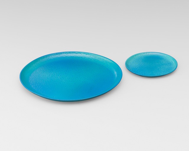 陶器風に見えますが、実はアルミ製。アルミの手触りを陶器のザラリとしたものに近づけるため、不良率が上がってしまうことも厭わず砂型に用いる砂の粗さを通常より細かいものにし、鋳造しております。そこに釉薬を塗ることで、この陶器と見紛う質感を実現いたしました。